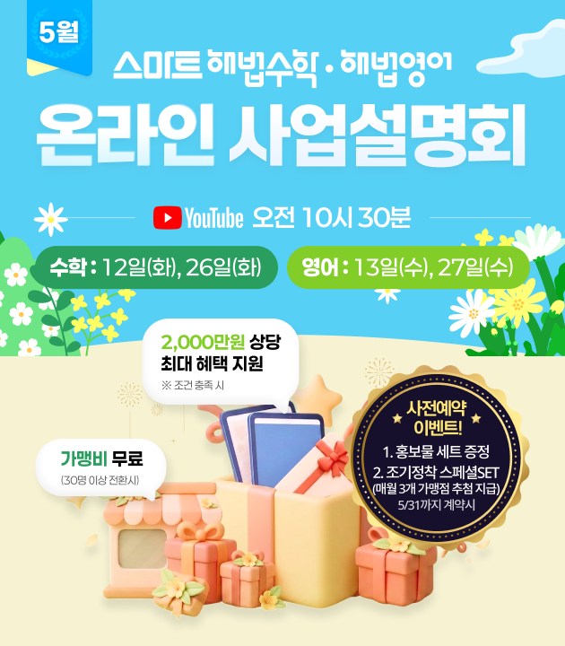 공지사항 스마트해법의 업데이트 정보 등 다양한 소식을 알려드립니다. 스마트해법 5월 사업설명회 진행 26.04.29 사업설명회 예약 바로가기 이전글 어린이날 이벤트! [스마트 퀴즈쇼] 4/27~5/8 목록으로