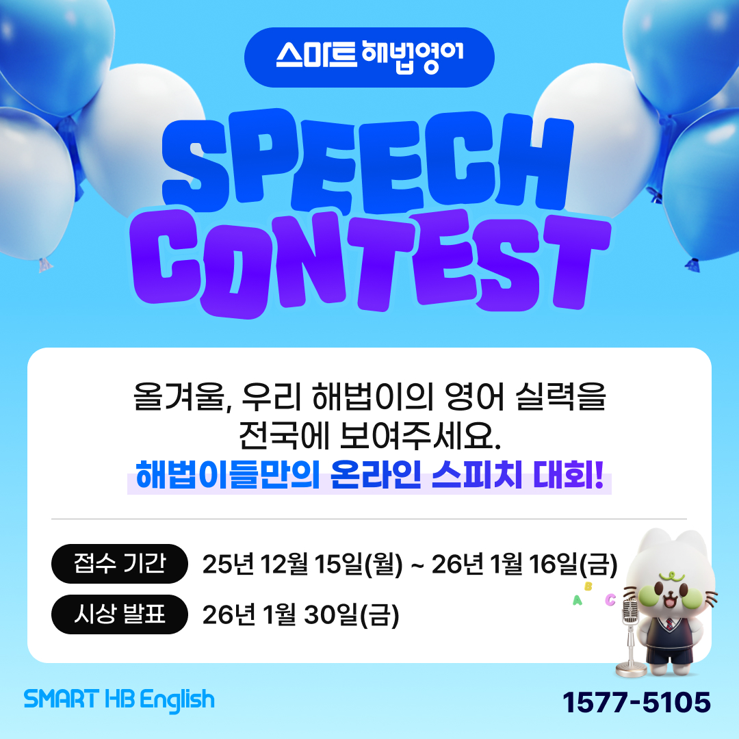 공지사항 스마트해법의 업데이트 정보 등 다양한 소식을 알려드립니다. [스마트해법영어] 제5회 Speech contest 25.12.15 스피치 콘테스트 이벤트 페이지 바로가기 이전글 🎅🏼HBTALK 캐롤과 함께하는 크리스마스 다음글 스마트해법 1월 사업설명회 진행 목록으로