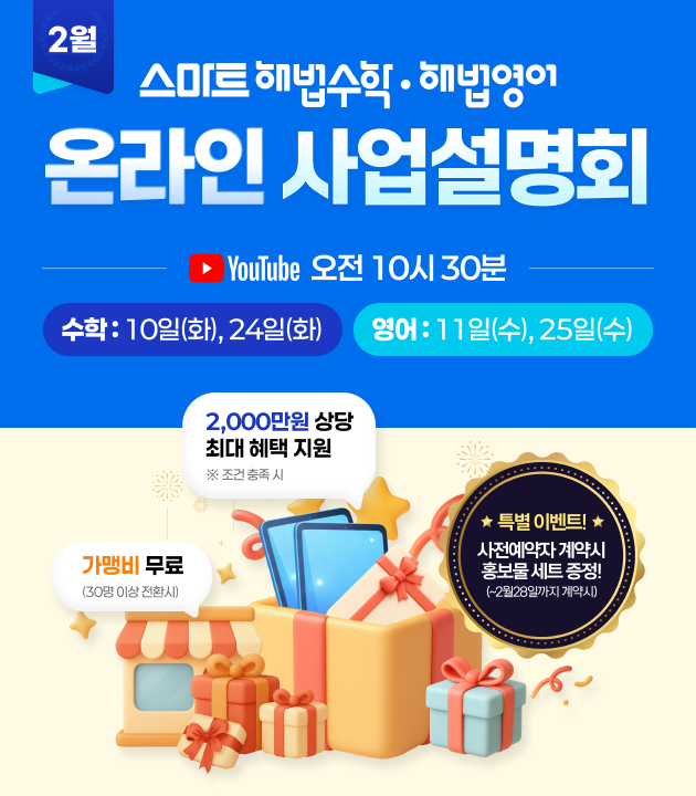 공지사항 스마트해법의 업데이트 정보 등 다양한 소식을 알려드립니다. 스마트해법 2월 사업설명회 진행 26.01.29 사업설명회 바로가기 이전글 스마트해법 1월 사업설명회 진행 다음글 스마트해법 3월 사업설명회 진행 목록으로